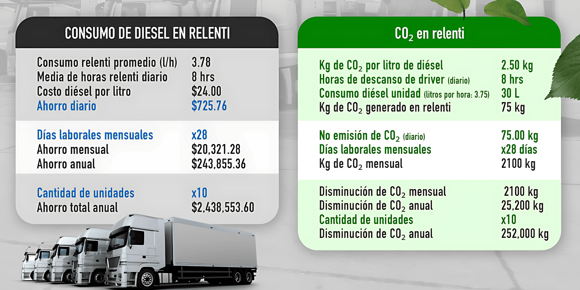 El ralentí consume hasta 3.8 litros de diésel por hora. Con 8 horas diarias, gastas más de $240,000 MXN al año por unidad.